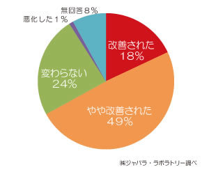 花粉症に悩む男女143人に、じゃばら果皮粉末360mgを含むカプセルを15日間飲用してもらいました。その結果、70%近い人たちが花粉症の改善を実感していることが確認されました。この調査では「症状が変わらない」、「無回答」とされた人の中には、花粉症の薬を服用しており、じゃばら本来の効果がわからないと答えている人も多く見られ、実際の改善率はもう少し高いと推測されます。