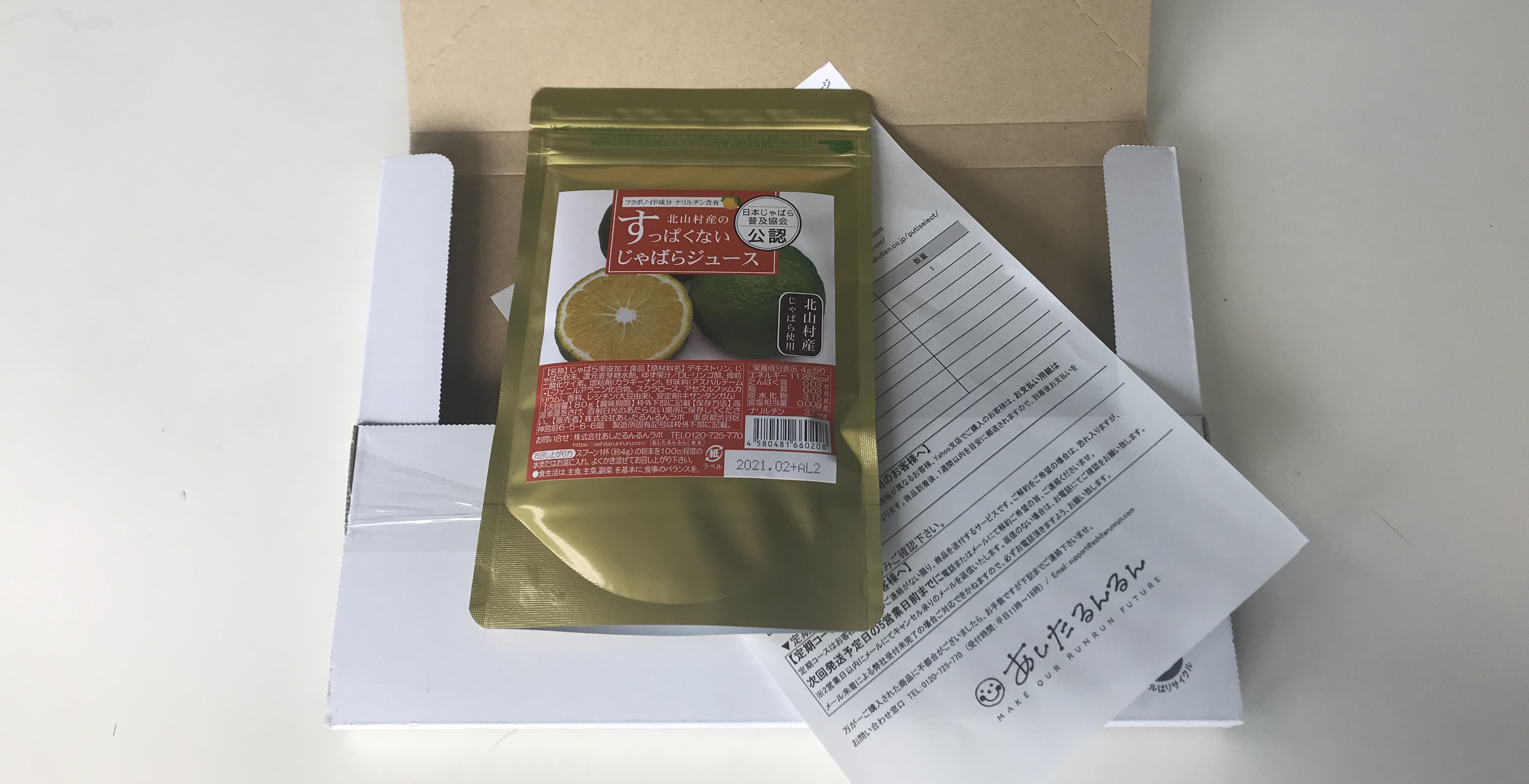 すっぱくない じゃばらジュースは、色々なサプリなどを発売している「あしたるんるん」さんの商品でした。