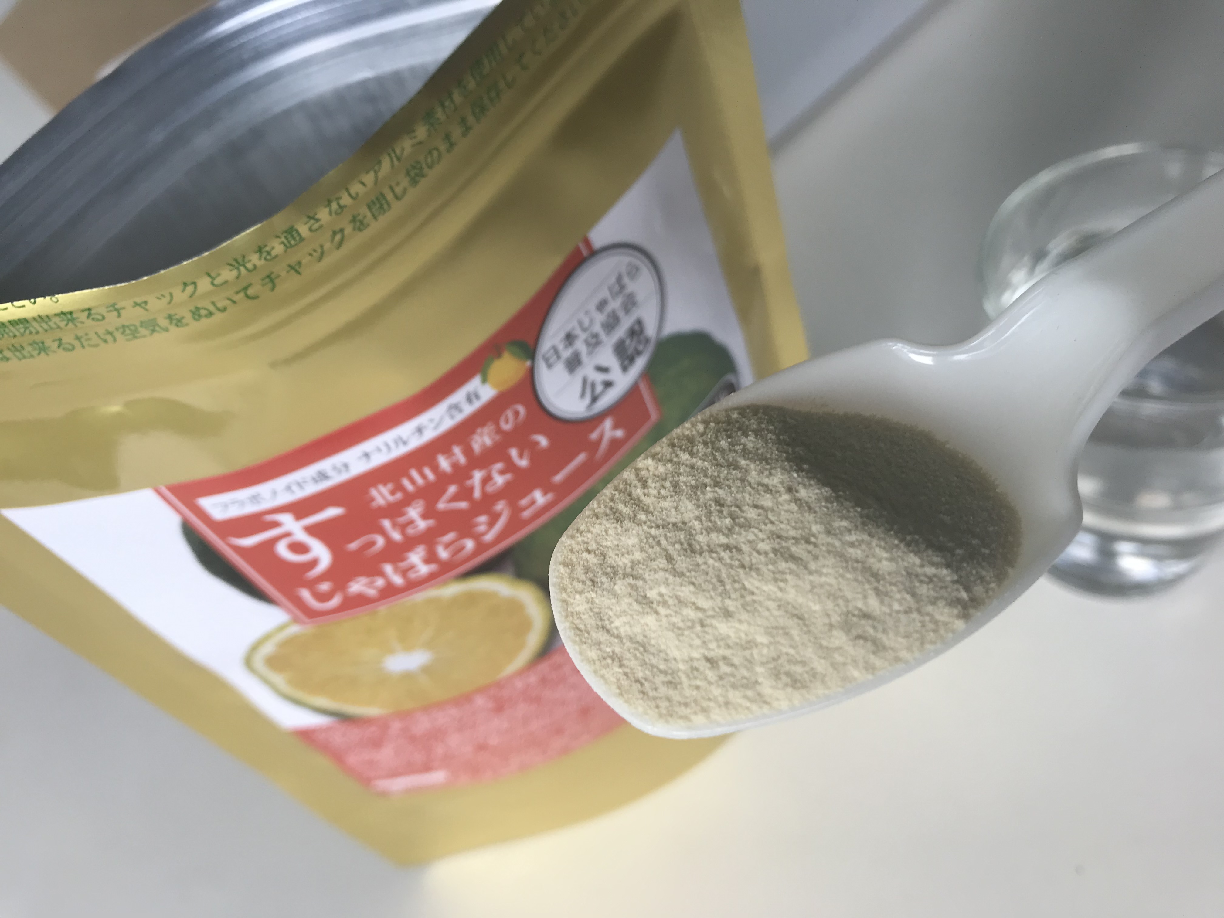 中身はパウダー状で、ほとんど感じませんが柑橘系の少し甘酸っぱいニオイがします・・・すっぱくないのかな?少し不安・・・